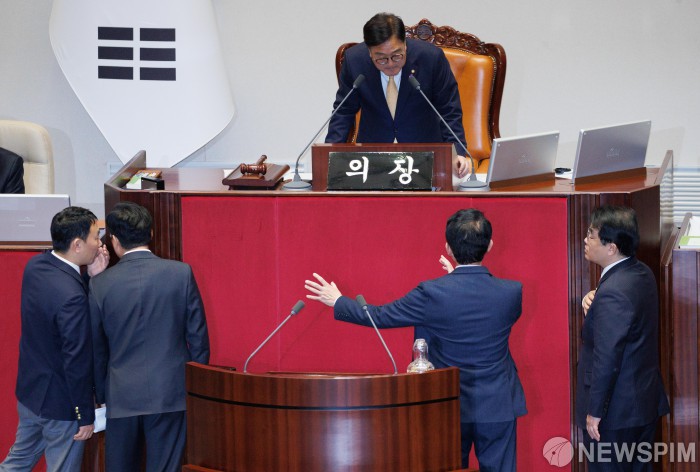 [서울=뉴스핌] 윤창빈 기자 = 우원식 국회의장이 10일 오후 서울 여의도 국회에서 열린 제418회국회(정기회) 제18차 본회의에서 박찬대 더불어민주당 원내대표, 진성준 정책위의장, 김상훈 국민의힘 정책위의장, 배준영 원내수석부대표와 논의하고 있다. 2024.12.10 pangbin@newspim.com