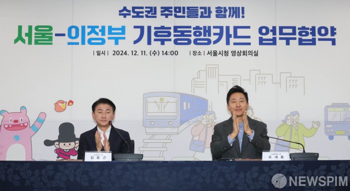 [서울=뉴스핌] 양윤모 기자 = 오세훈 서울시장과 김동근 의정부시장이 11일 오후 서울시청에서 열린 '서울시-의정부 기후동행카드 사업 참여 업무협약'에 참석 박수치고 있다. 2024.12.11 yym58@newspim.com