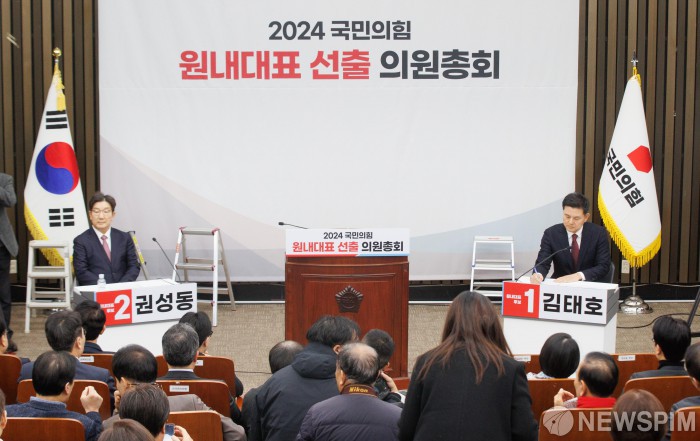 [서울=뉴스핌] 윤창빈 기자 = 국민의힘 원내대표에 출마한 권성동(왼쪽), 김태호 의원이 12일 오전 서울 여의도 국회에서 열린 원내대표 선출 의원총회에서 토론을 준비하고 있다.2024.12.12 pangbin@newspim.com