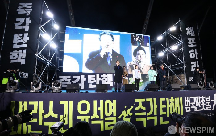 [서울=뉴스핌] 정일구 기자 = 윤석열 대통령에 대한 두 번째 탄핵소추안이 가결된 14일 오후 서울 여의도 국회 앞에서 열린 윤 대통령 탄핵 촉구 촛불집회에서 이재명 더불어민주당 대표가 시민들에게 감사 인사를 전하고 있다. 2024.12.14 mironj19@newspim.com