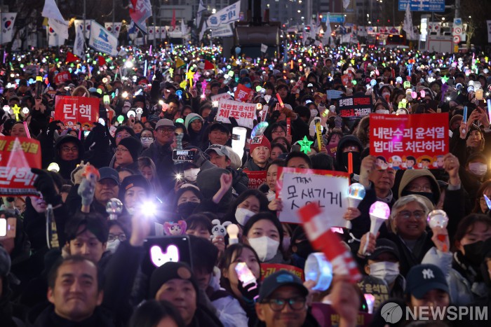 [서울=뉴스핌] 정일구 기자 = 윤석열 대통령에 대한 두 번째 탄핵소추안이 가결된 14일 오후 서울 여의도 국회 앞에서 열린 윤 대통령 탄핵 촉구 촛불집회에서 참가자들이 탄핵소추안 가결 소식에 환호하고 있다. 2024.12.14 mironj19@newspim.com