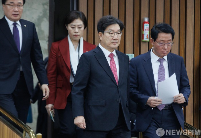 [서울=뉴스핌] 윤창빈 기자 = 권성동 국민의힘 권성동 당대표 권한대행 겸 원내대표, 김상훈 정책위의장과 당직자들이 17일 오전 서울 여의도 국회에서 열린 원내대책회의에 참석하고 있다. 2024.12.17 pangbin@newspim.com