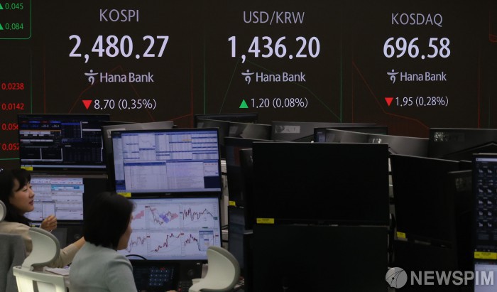 [서울=뉴스핌] 양윤모 기자 = 대통령의 탄핵 혼란 속 외국인이 순매도를 주도하고 있는 가운데, 17일 오전 9시 코스피지수가 전 거래일 종가보다 8.10포인트(-0.33%) 하락한 2,480.87로, 코스닥지수는 0.75포인트(-0.11%) 하락한 697.78로 오전 거래를 시작했다. 서울 외환시장에서 달러/원 환율은 전 거래일보다 1.50원(0.10%) 상승한 1,436.50원에 오전 거래를 시작한 가운데, 서울 중구 하나은행 딜링룸에서 직원들이 업무를 보고 있다. 2024.12.17 yym58@newspim.com