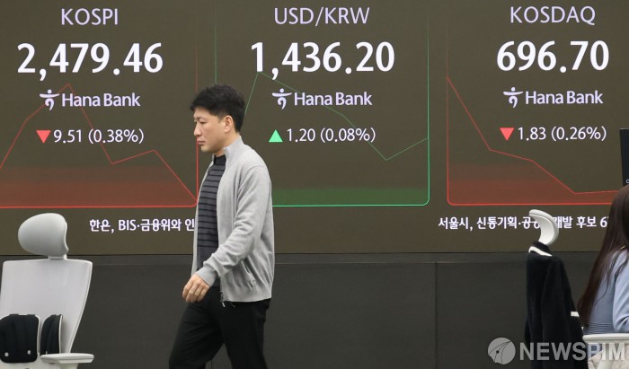 [서울=뉴스핌] 양윤모 기자 = 대통령의 탄핵 혼란 속 외국인이 순매도를 주도하고 있는 가운데, 17일 오전 9시 코스피지수가 전 거래일 종가보다 8.10포인트(-0.33%) 하락한 2,480.87로, 코스닥지수는 0.75포인트(-0.11%) 하락한 697.78로 오전 거래를 시작했다. 서울 외환시장에서 달러/원 환율은 전 거래일보다 1.50원(0.10%) 상승한 1,436.50원에 오전 거래를 시작한 가운데, 서울 중구 하나은행 딜링룸에서 직원들이 업무를 보고 있다. 2024.12.17 yym58@newspim.com