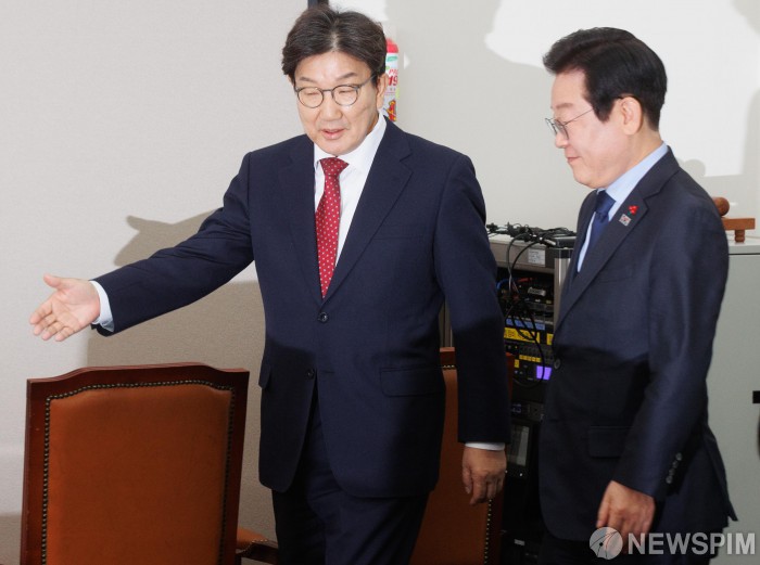 [서울=뉴스핌] 윤창빈 기자 = 권성동 국민의힘 대표 권한대행 겸 원내대표가 18일 오후 서울 여의도 국회에서 이재명 더불어민주당 대표를 예방하고 있다. 2024.12.18 pangbin@newspim.com