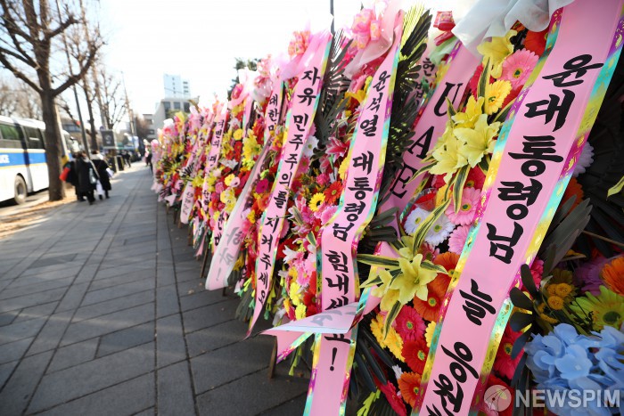 [서울=뉴스핌] 정일구 기자 = 18일 오후 서울 종로구 헌법재판소 앞에 '12·3 비상계엄' 관련 윤석열 대통령의 탄핵을 반대하는 지지자들의 화환이 놓여 있다. 2024.12.18 mironj19@newspim.com
