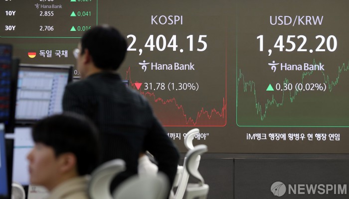 [서울=뉴스핌] 최지환 기자 = 장중 2400선 밑으로 내려갔던 20일 코스피가 낙폭을 줄이며 전 거래일보다 31.78포인트(1.30%) 하락한 2404.15에 마감했다. 코스닥지수는 전 거래일보다 16.05포인트(2.35%) 내린 668.31에 거래를 마쳤다. 오후 3시 30분 기준 서울 외환시장에서 달러/원 환율은 1.9원 내린 1451.4원을 기록했다. 이날 오후 서울 중구 하나은행 딜링룸에서 딜러들이 업무를 보고 있다. 2024.12.20 choipix16@newspim.com