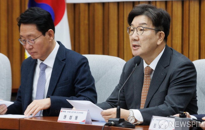[서울=뉴스핌] 윤창빈 기자 = 권성동 국민의힘 대표 권한대행 겸 원내대표가 27일 오전 서울 여의도 국회에서 열린 내수경기활성화 민당정협의회에서 모두발언을 하고 있다. 2024.12.27 pangbin@newspim.com