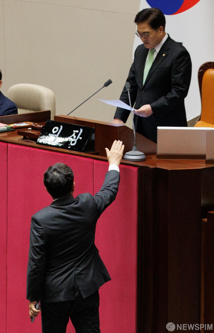 [서울=뉴스핌] 윤창빈 기자 = 27일 오후 서울 여의도 국회에서 열린 본회의에서 우원식 국회의장이 한덕수 권한대행의 탄핵 소추 가결 요건을 151석으로 정하자 권성동 국민의힘 대표 권한대행 겸 원내대표가 항의하고 있다. 2024.12.27 pangbin@newspim.com