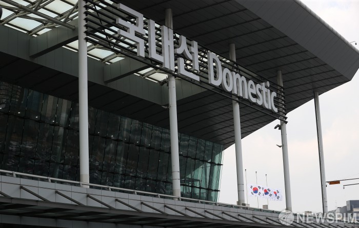 [서울=뉴스핌] 정일구 기자 = 전남 무안국제공항에서 발생한 제주항공 여객기 참사 이틀째인 30일 서울 강서구 김포국제공항 국내선 청사에 희생자를 애도하는 조기가 게양돼 있다. 정부는 제주항공 여객기 사고와 관련해 내년 1월 4일까지 7일간을 국가애도기간으로 지정했다. 2024.12.30 mironj19@newspim.com