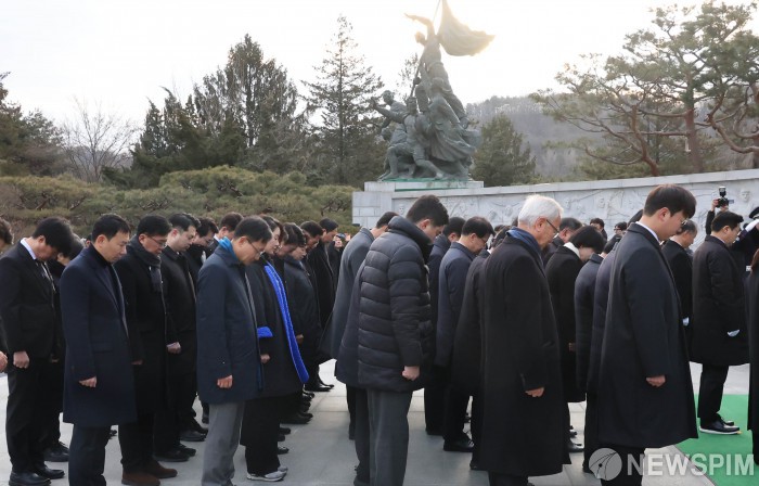 [서울=뉴스핌] 양윤모 기자 = 박찬대 더불어민주당 원내대표와 국회의원들이 2025년 을사년(乙巳年) 첫날인 1일 오전 서울 동작구 국립서울현충원을 찾아 현충탑을 참배하고 있다. 2025.01.01 yym58@newspim.com