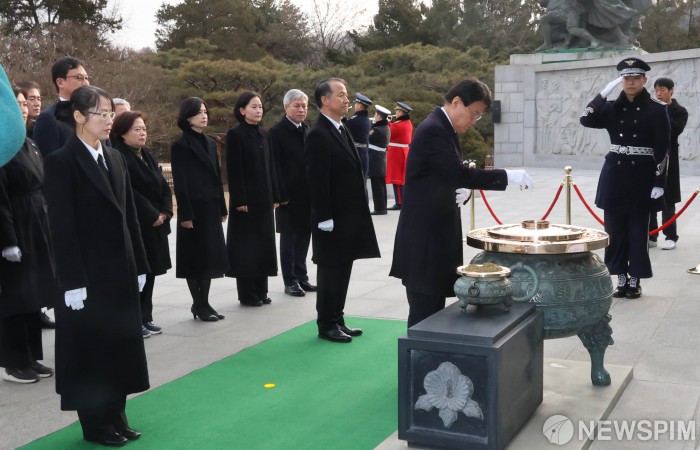 [서울=뉴스핌] 양윤모 기자 = 황운하 조국혁신당 원내대표가 2025년 을사년(乙巳年) 첫날인 1일 오전 국회의원들과 함께 서울 동작구 국립서울현충원을 찾아 현충탑에 분향하고 있다. 2025.01.01 yym58@newspim.com
