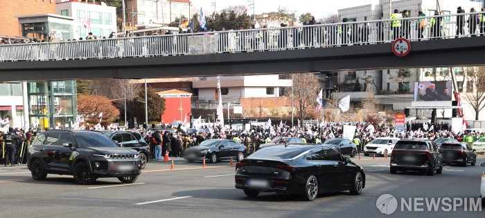 [서울=뉴스핌] 이호형 기자 = 고위공직자범죄수사처(공수처)가 내란 우두머리 혐의를 받는 윤석열 대통령의 체포영장 집행을 중지 한 3일 오후 서울 용산구 한남동 대통령 관저 인근 도로에서 수사관 차량들이 유턴을 하며 과천 공수처로 돌아가고 있다. 2025.01.03 leemario@newspim.com