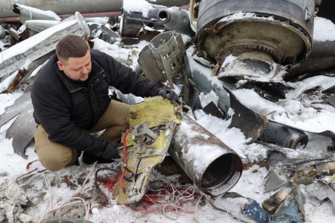 | 우크라이나 검찰관이 북한제 미사일로 추정되는 미사일 파편을 조사하고 있다. [사진=로이터] |