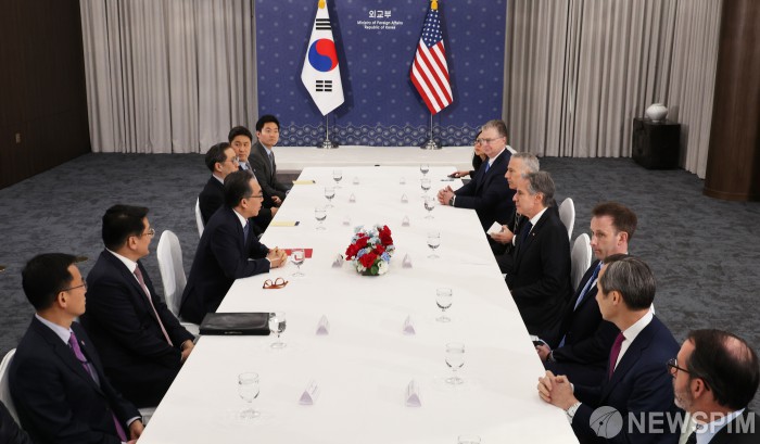[서울=뉴스핌] 양윤모 기자 = 조태열 외교부 장관과 퇴임을 앞두고 방한한 토니 블링컨 미국 국무장관이 6일 오전 외교부 청사에서 열린 한·미 외교장관 오찬 회담을 하고 있다. 미 국무장관이 방한하는 것은 지난해 3월 '제3차 민주주의 정상회의 참석' 이후 약 10개월 만이며, 토니 블링컨 국무장관은 조 장관과의 회담에 앞서 최상목 대통령 권한대행 부총리 겸 기획재정부 장관을 면담했다. [공동취재] 2025.01.06 yym58@newspim.com