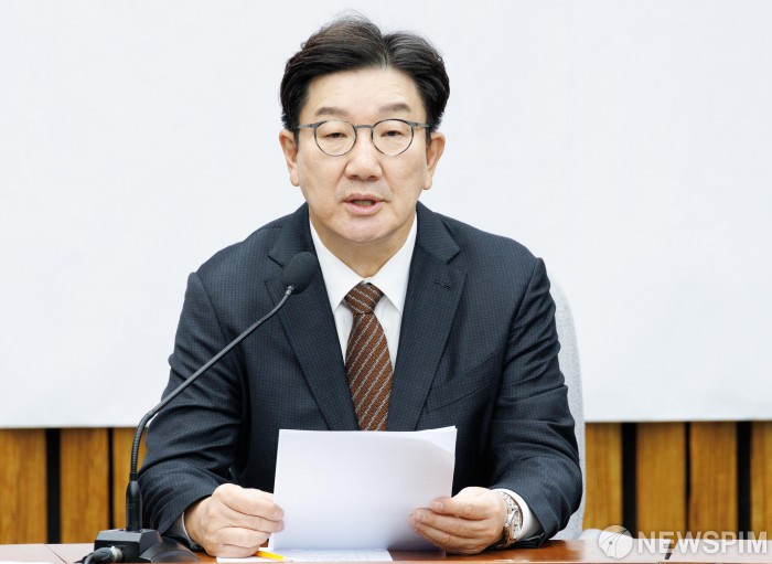 [서울=뉴스핌] 윤창빈 기자 = 권성동 국민의힘 원내대표가 7일 오전 서울 여의도 국회에서 열린 원내대책회의에서 모두발언을 하고 있다. 2025.01.07 pangbin@newspim.com