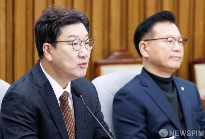 [서울=뉴스핌] 윤창빈 기자 = 권성동 국민의힘 원내대표가 7일 오전 서울 여의도 국회에서 열린 원내대책회의에서 모두발언을 하고 있다. 2025.01.07 pangbin@newspim.com
