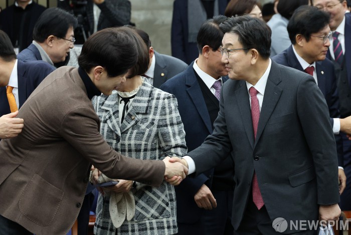[서울=뉴스핌] 정일구 기자 = 권성동 국민의힘 원내대표가 8일 오전 서울 여의도 국회에서 열린 의원총회에서 참석 의원들과 인사하고 있다. 2025.01.08 mironj19@newspim.com
