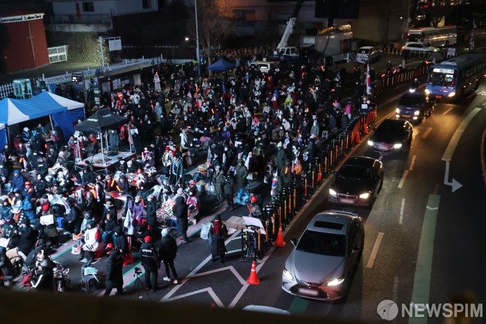[서울=뉴스핌] 양윤모 기자 = 윤석열 대통령에 대한 2차 체포영장이 발부된 뒤 13일 새벽 서울 용산구 한남동 대통령 관저 인근에서 윤 대통령 체포 반대 집회가 열리고 있다. 2025.01.13 yym58@newspim.com