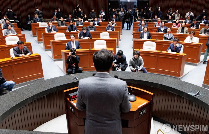 [서울=뉴스핌] 윤창빈 기자 = 권성동 국민의힘 원내대표가 13일 오후 서울 여의도 국회에서 열린 의원총회에서 모두발언을 하고 있다. 2025.01.13 pangbin@newspim.com