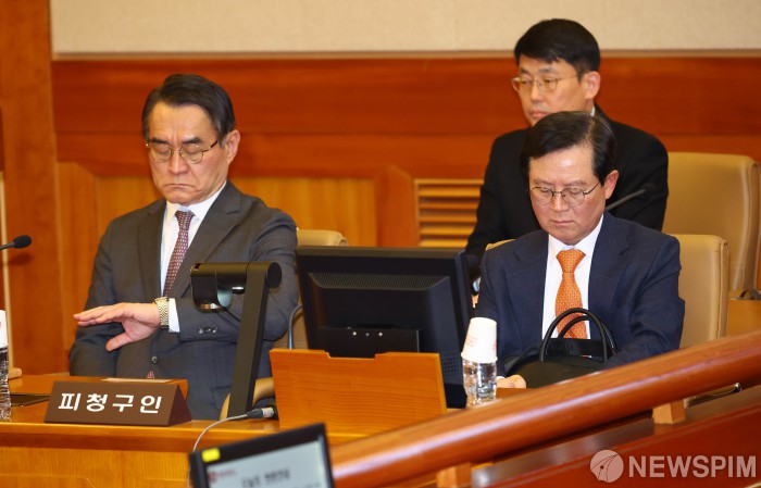 [서울=뉴스핌] 윤석열 대통령 측 변호인단인 배보윤, 윤갑근 변호사가 14일 서울 종로구 헌법재판소에서 열린 윤석열 대통령 탄핵심판 사건 첫 변론기일에 출석해 시간을 확인하고 있다. 2025.01.14. 2025.01.14. 2025.01.14. gdlee@newspim.com