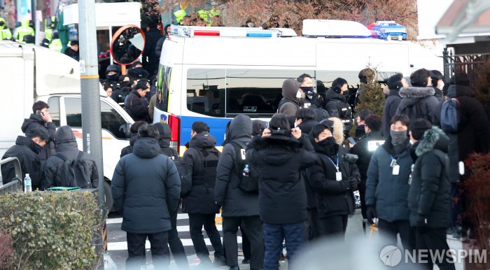 [서울=뉴스핌] 최지환 기자 = 15일 오전 서울 용산구 대통령 관저 입구에서 공수처 및 경찰 수사관들이 대기하고 있다. 2025.01.15 choipix16@newspim.com