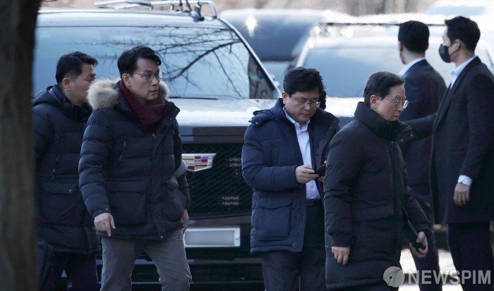[과천=뉴스핌] 김학선 기자 = 윤석열 대통령 체포영장 집행이 진행된 15일 오전 윤 대통령이 탑승한 차량이 경기도 정부과천청사 고위공직자범죄수사처 청사로 들어간 뒤 윤상현 국민의힘 의원 등이 뒤따라 들어가고 있다. 2025.01.15 yooksa@newspim.com