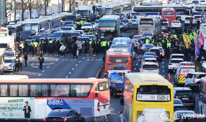 [서울=뉴스핌] 양윤모 기자 = 15일 오전 12·3 비상계엄 선포로 '내란 수괴(우두머리)' 혐의를 받는 윤석열 대통령에 대한 2차 체포영장이 고위공직자범죄수사처와 경찰에 의해 집행된 가운데, 윤 대통령의 지지자들이 공수처로 이동을 저지하기 위해 도로를 점령하고 있다. 2025.01.15 yym58@newspim.com