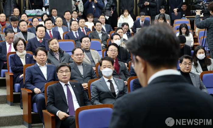 [서울=뉴스핌] 정일구 기자 = 16일 오전 서울 여의도 국회에서 열린 국민의힘 비상의원총회에서 참석 의원들이 권성동 원내대표의 발언을 경청하고 있다. 2025.01.16 mironj19@newspim.com
