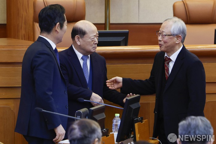 [서울=뉴스핌] 이길동 기자 =정청래(왼쪽) 단장과 국회 탄핵소추단이 16일 서울 종로구 헌법재판소 대심판정에서 열린 윤석열 대통령 탄핵심판 2회 변론기일서 윤석열 대통령의 법률대리인과 인사를 하고 있다. 2025.01.16 gdlee@newspim.com