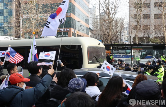 [서울=뉴스핌] 양윤모 기자 = 12·3 비상계엄 선포로 '내란 수괴(우두머리)' 혐의로 고위공직자범죄수사처에 체포된 윤석열 대통령이 18일 오후 2시 서울서부지방법원에서 열리는 구속 전 피의자 심문(영장실질심사)에 출석한 가운데, 윤 대통령의 구속을 반대하는 지지자들이 법원 앞에서 집회를 하고 있다. 2025.01.18 yym58@newspim.com