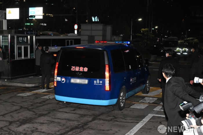 [서울=뉴스핌] 김학선 기자 = 윤석열 대통령이 18일 서울 마포구 서부지방법원에서 열린 구속 전 피의자심문(영장실질심사)을 마친 뒤 법무부 호송차량으로 서울구치소로 돌아가고 있다. 2025.01.18 yooksa@newspim.com