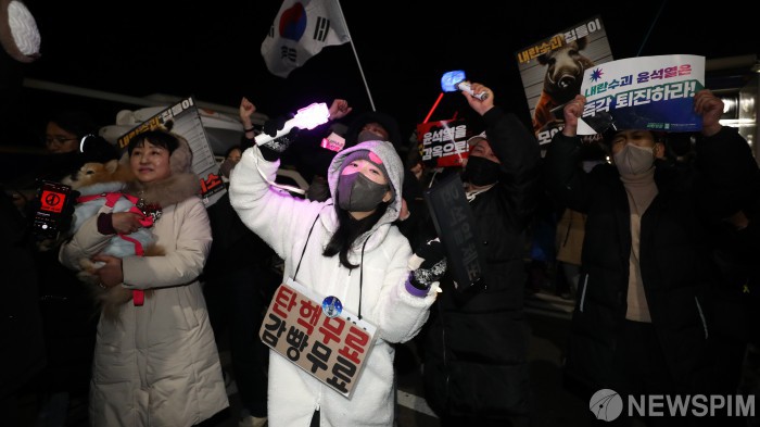 [의왕=뉴스핌] 이형석 기자 = 윤석열 대통령의 구속 영장이 발부된 19일 새벽 경기 의왕시 서울구치소 앞에서 구속 촉구 집회를 열고 있던 참석자들이 환호를 하고 있다. 2025.01.19 leehs@newspim.com