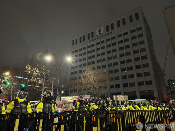 [서울=뉴스핌] 이형석 기자 = 19일 새벽 서울 마포구 서울서부지방법원 청사 앞에서 경찰이 차단선을 설치하고 있다. 이날 윤석열 대통령 구속영장이 발부되자 윤 대통령 지지자들이 서울서부지법에 난입해 유리창을 깨고 집기를 훼손하는 등 난동을 부려 경찰이 강제진압에 나갔다. 2025.01.19 leehs@newspim.com
