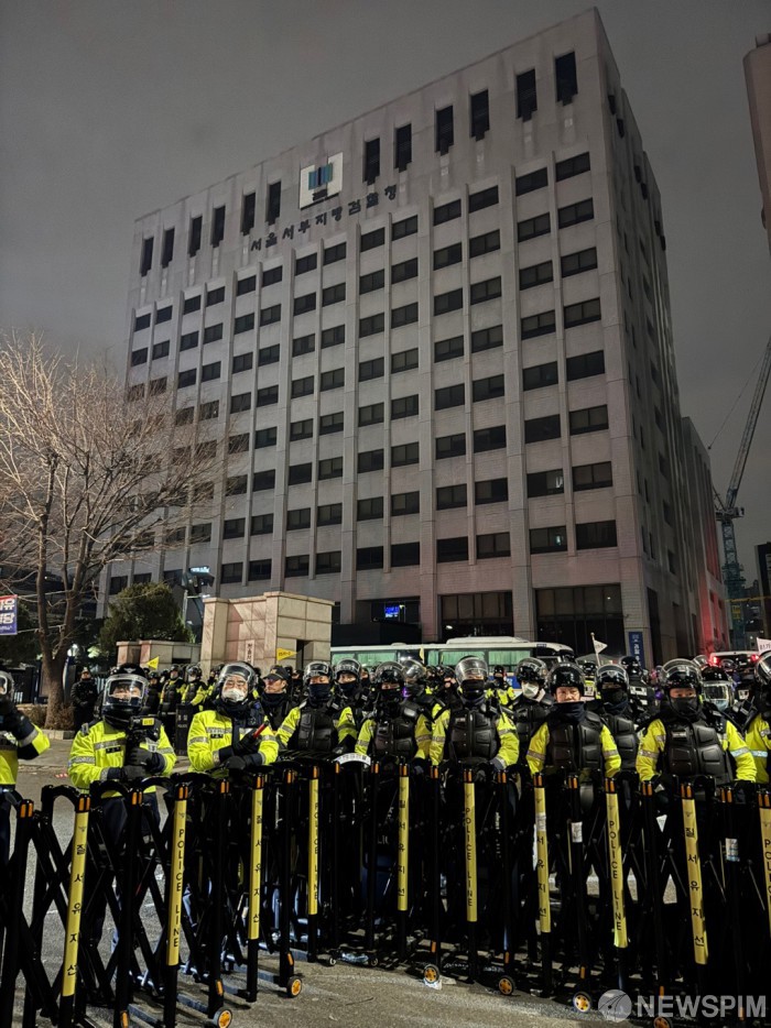 [서울=뉴스핌] 이형석 기자 = 19일 새벽 서울 마포구 서울서부지방법원 청사 앞에서 경찰이 차단선을 설치하고 있다. 이날 윤석열 대통령 구속영장이 발부되자 윤 대통령 지지자들이 서울서부지법에 난입해 유리창을 깨고 집기를 훼손하는 등 난동을 부려 경찰이 강제진압에 나갔다. 2025.01.19 leehs@newspim.com