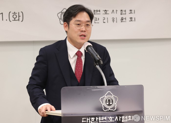 [서울=뉴스핌] 이호형 기자 = 제53대 대한변호사협회 협회장에 당선된 로스쿨 출신 김정욱 변호사가 21일 오전 서울 서초구 대한변협회관에서 당선 소감을 밝히고 있다. 2025.01.21 leemario@newspim.com