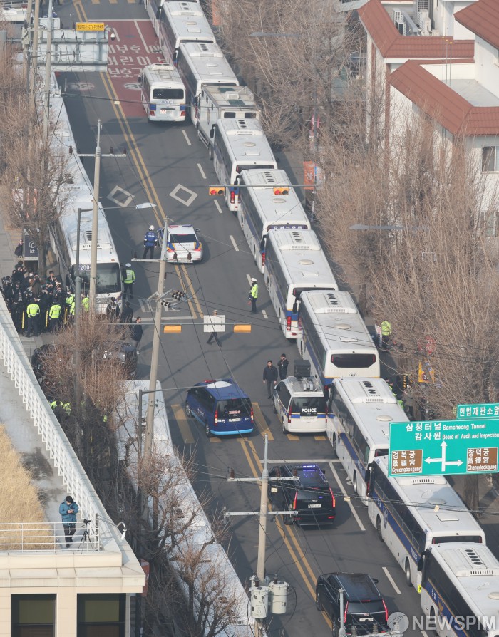[서울=뉴스핌] 김학선 기자 = 헌재 탄핵심판 3차 변론기일에 출석하는 윤석열 대통령을 태운 차량과 경호차량이 21일 서울 종로구 헌법재판소에 도착하고 있다. 2025.01.21 yooksa@newspim.com