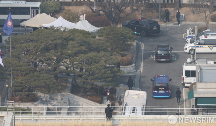 [서울=뉴스핌] 김학선 기자 = 헌재 탄핵심판 3차 변론기일에 출석하는 윤석열 대통령을 태운 차량과 경호차량이 21일 서울 종로구 헌법재판소에 도착하고 있다. 2025.01.21 yooksa@newspim.com