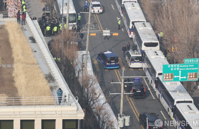 [서울=뉴스핌] 김학선 기자 = 헌재 탄핵심판 3차 변론기일에 출석하는 윤석열 대통령을 태운 차량과 경호차량이 21일 서울 종로구 헌법재판소에 도착하고 있다. 2025.01.21 yooksa@newspim.com