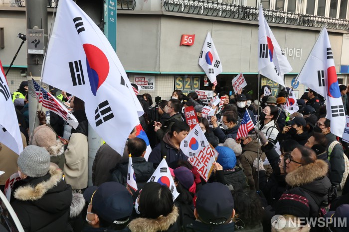 [서울=뉴스핌] 양윤모 기자 = 윤석열 대통령이 21일 오후 2시에 열리는 탄핵 심판 변론에 직접 출석한 가운데, 서울 종로구 헌법재판소 앞에서 윤 대통령 지지자들이 집회를 하고 있다. 2025.01.21 yym58@newspim.com