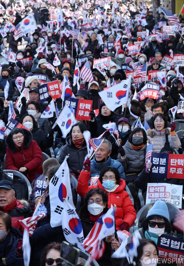 [서울=뉴스핌] 사진공동취재단 = 윤석열 대통령 탄핵심판 4차 변론기일인 23일 오후 서울 종로구 헌법재판소 인근에서 윤 대통령 지지자들이 모여 탄핵무효 구호를 외치고 있다. 2025.01.23 photo@newspim.com
