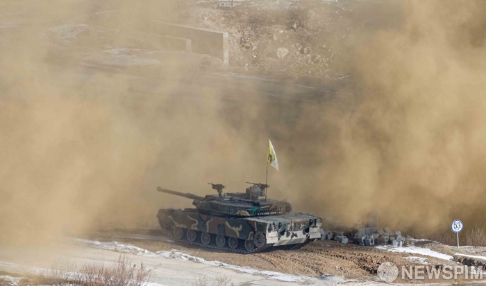 [포천=뉴스핌] 사진공동취재단 = 23일 경기 포천 승진훈련장에서 열린 '공지합동 통합화력 운용 훈련'에서 K1E1 전차가 기동하고 있다. 2025.01.23 photo@newspim.com