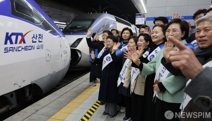 [서울=뉴스핌] 김학선 기자 = 김선민 조국혁신당 당대표 권한대행, 황운하 원내대표를 비롯한 의원들이 설 명절을 앞둔 24일 오전 용산역에서 귀성객들을 향해 인사하고 있다. 2025.01.24 yooksa@newspim.com