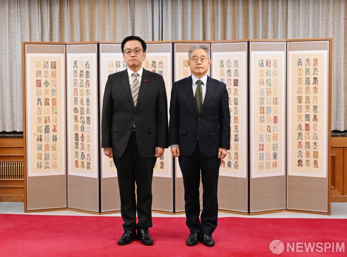 [서울=뉴스핌] 최상목 대통령 권한대행 부총리 겸 기획재정부 장관이 31일 서울 종로구 정부서울청사에서 열린 2024년 추계 신임장 수여식에서 한병진 주파나마대사에게 신임장 수여 후 기념사진을 찍고 있다. [사진=기획재정부] 2025.01.31 photo@newspim.com