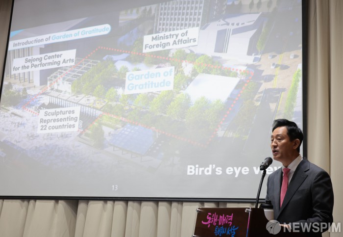 [서울=뉴스핌] 이길동 기자 = 오세훈 서울시장이 4일 서울시청에서 열린 주한대사 초청 감사의 정원 조성 브리핑에서 ‘감사의 정원’ 조성계획을 밝히고 있다. 2025.02.04. gdlee@newspim.com