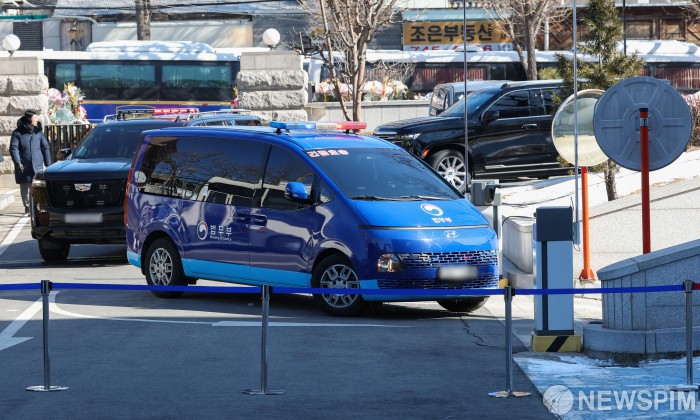 [서울=뉴스핌] 사진공동취재단 = 윤석열 대통령 탄핵심판 5차 변론기일이 열린 4일 오후 윤 대통령이 탄 법무부 호송차량이 서울 종로구 헌법재판소 안으로 들어서고 있다. 2025.02.04 photo@newspim.com