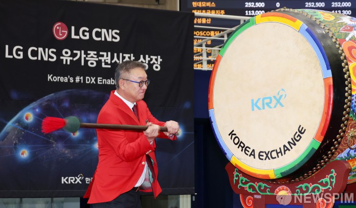 [서울=뉴스핌] 정일구 기자 = 현신균 LG CNS 대표이사 사장이 5일 오전 서울 영등포구 KRX한국거래소 서울사무소에서 열린 LG CNS(LG씨엔에스) 상장식에서 유가증권시장 상장을 기념하는 북을 치고 있다. 2025.02.05 mironj19@newspim.com