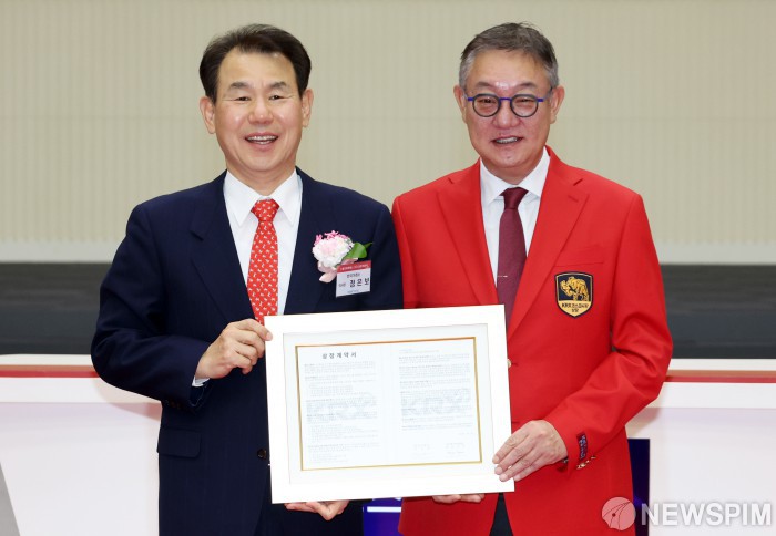 [서울=뉴스핌] 정일구 기자 = 정은보 한국거래소 이사장이 5일 오전 서울 영등포구 KRX한국거래소 서울사무소에서 열린 LG CNS(LG씨엔에스) 상장식에서 현신균 LG CNS 대표이사 사장에게 상장계약서를 전달한 뒤 기념촬영을 하고 있다. 2025.02.05 mironj19@newspim.com
