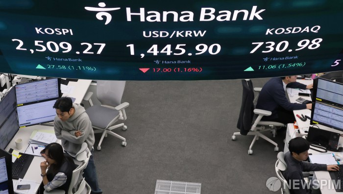 [서울=뉴스핌] 양윤모 기자 = 5일 오후 코스피 지수가 전 거래일 종가보다 27.58포인트(1.11%) 오른 2,509.27로, 코스닥 지수는 11.06포인트(1.54%) 오른 730.98로 거래를 마감했다. 서울 외환시장에서 달러/원 환율은 전 거래일보다 17.00원 내린 1,445.90원에 거래되는 가운데, 서울 중구 하나은행 딜링룸에서 직원들이 업무를 보고 있다. 2025.02.05 yym58@newspim.com