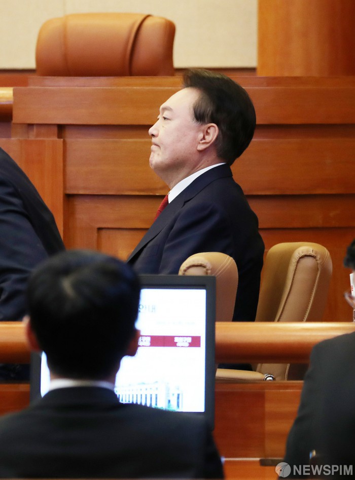 [서울=뉴스핌] 사진공동취재단 = 윤석열 대통령 탄핵심판 6차 변론이 열린 6일 서울 종로구 헌법재판소 대심판정으로 윤 대통령이 출석하고 있다. 2024.02.06 photo@newspim.com